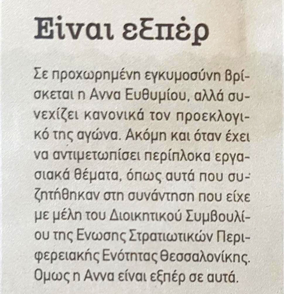 Σε προχωρημένη εγκυμοσύνη Βρίσκεται η Άννα Ευθυμίου, αλλά συνεχίζει κανονικά τον προεκλογικό της αγώνα. Ακόμη και όταν έχει να αντιμετωπίσει περίπλοκα εργασιακά θέματα, όπως αυτά που συζητήθηκαν στη συνάντηση που είχε με μέλη του Διοικητικού Συμβουλίου της Ένωσης Στρατιωτικών Περιφερειακής Ενότητας Θεσσαλονίκης. Όμως η Άννα είναι εξπέρ σε αυτά.